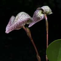 Bulbophyllum arfakianum is found in the Arfak Mountains of Papua New Guinea as a small sized, unifoliate, hot growing epiphyte at elevations of 50 to 400 meters in rainforests, farmland margins and river valleys on tree branches with an ascending growth habit and pseudobulbs that are 2.5 cm apart on the rhizome and blooms in the late winter and spring as well as late summer and autumn on a to 14 cm long, stout inflorescence with triangular bracts and carrying a solitary flower held well above the leaves.