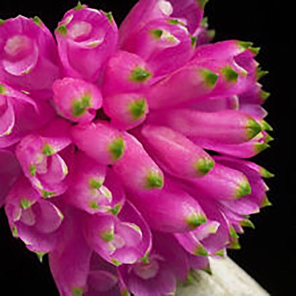 Dendrobium purpureum is found in the the Moluccas, New Guinea, the Caroline Islands, Fiji and Vanuatu as a small to large sized, hot to cool growing epiphyte from coastal lowlands to montane forests at elevations of sealevel to 1150 meters with clustered, cylindrical to spindle-shaped, erect, curved or pendulous, grooved with age, slightly swollen basally, yellow green to purple stems that have silvery sheaths carrying several, apical, lanceolate, dark green, deciduous leaves that alternate along the stem in 2 rows and blooms at most any time of the year with spring as the main time on a 2.5 cm long, several to many flowered inflorescence with the semi-closed flowers held in a cluster arising on leafy and leafless stems.