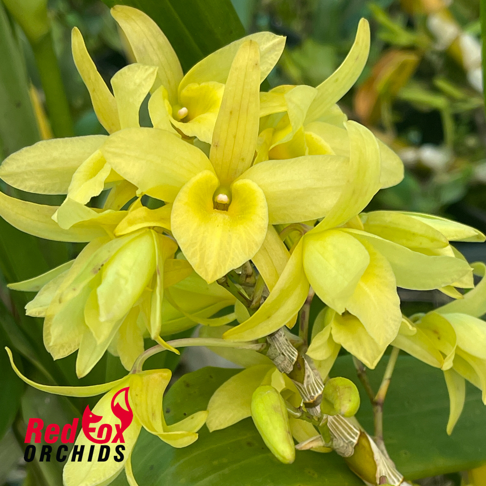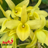 Dendrobium Spring Bird 'Tsuyama' is a superb nobile type dendrobium with dozens and dozens of 3.5cm flowers colored in yellow and peachy orange. The flowers are fragrant and last for over a month. These are multiple-cane plants that can produce many flowers. As the name implies, this plant is a spring bloomer, typically flowering between September and November.
