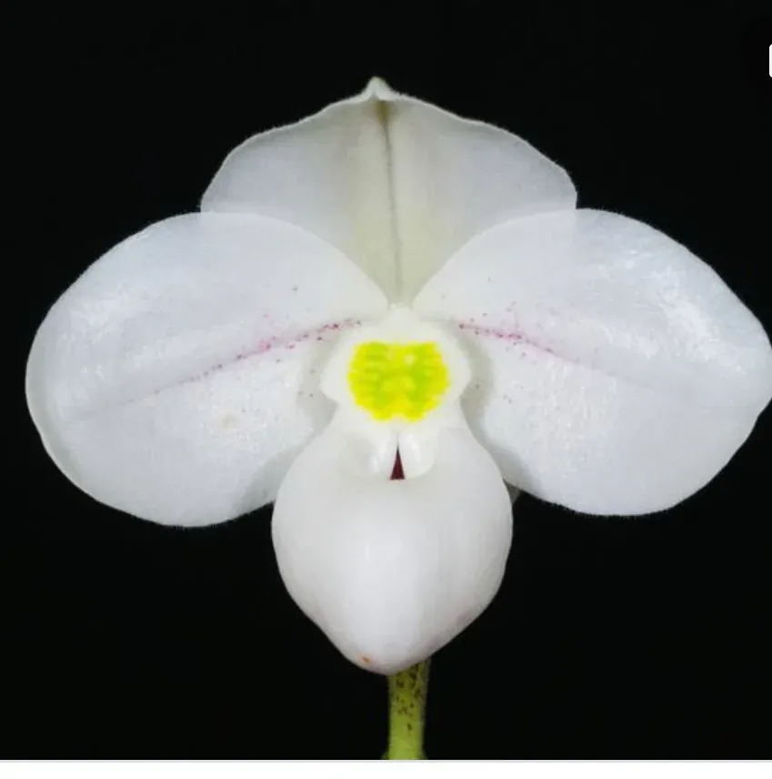 Paphiopedilum thaianum is found in Thailand in the shade of primary forests on steep cliffs and slopes of highly eroded limestone at elevations of 350 to 450 meters as a miniature sized, hot growing lithophyte with 3 to 5, narrowly elliptic to oblong, rounded and minutely tridenticulate apically, mottled very dark and pale green above, heavily mottled purple beneath, ciliate at the base leaves that blooms in the spring on an erect, shortly but densely white pubescent, erect, 6 to 17 cm long, single flowered inflorescence with conduplicate, broadly ovate, obtuse, pale green, spotted purple floral bracts.