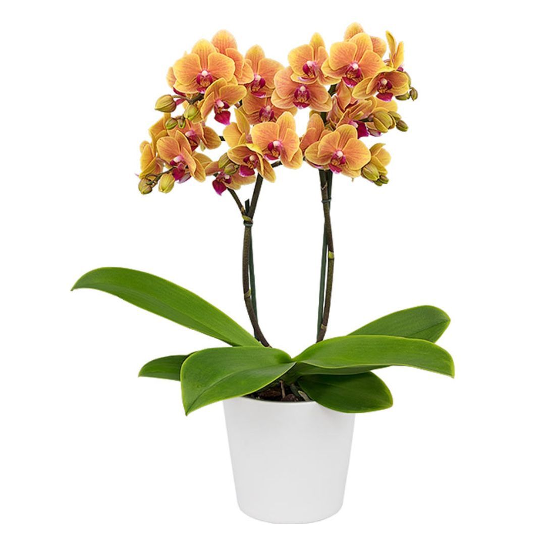 Phalaenopsis Grazia Orchid (Grace in Italian) has sprays of Yellow and Orange flowers with a magenta/red lip